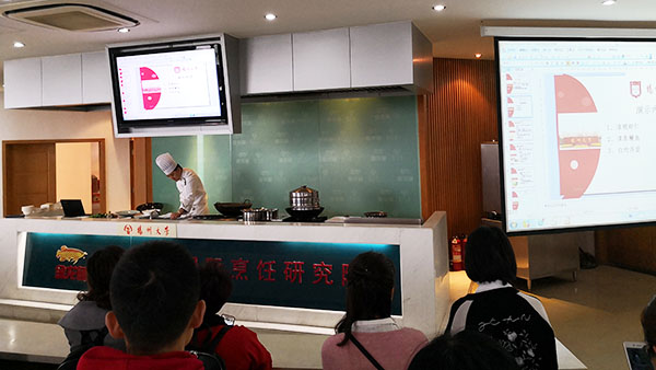 4月4日全體學(xué)員前往揚(yáng)州大學(xué)烹飪學(xué)院烹調(diào)實(shí)驗(yàn)室見習(xí)觀摩。揚(yáng)州大學(xué)烹飪學(xué)院外事辦公室主任章海風(fēng)博士向大家介紹學(xué)院的發(fā)展歷程、基本設(shè)施、師資力量及最新科研進(jìn)展。學(xué)院黨委孫書記致歡迎辭。揚(yáng)州大學(xué)烹飪學(xué)院唐建華副教授親自為參會(huì)代表演示了:清炒蝦仁、清蒸鱖魚、白灼芥藍(lán) 三道健康菜肴的低油低鹽烹調(diào)方法。唐教授在講解過程中特別強(qiáng)調(diào)讓菜肴呈現(xiàn)食物本來的滋味,而不是過度依賴重油重鹽和各種調(diào)味品。